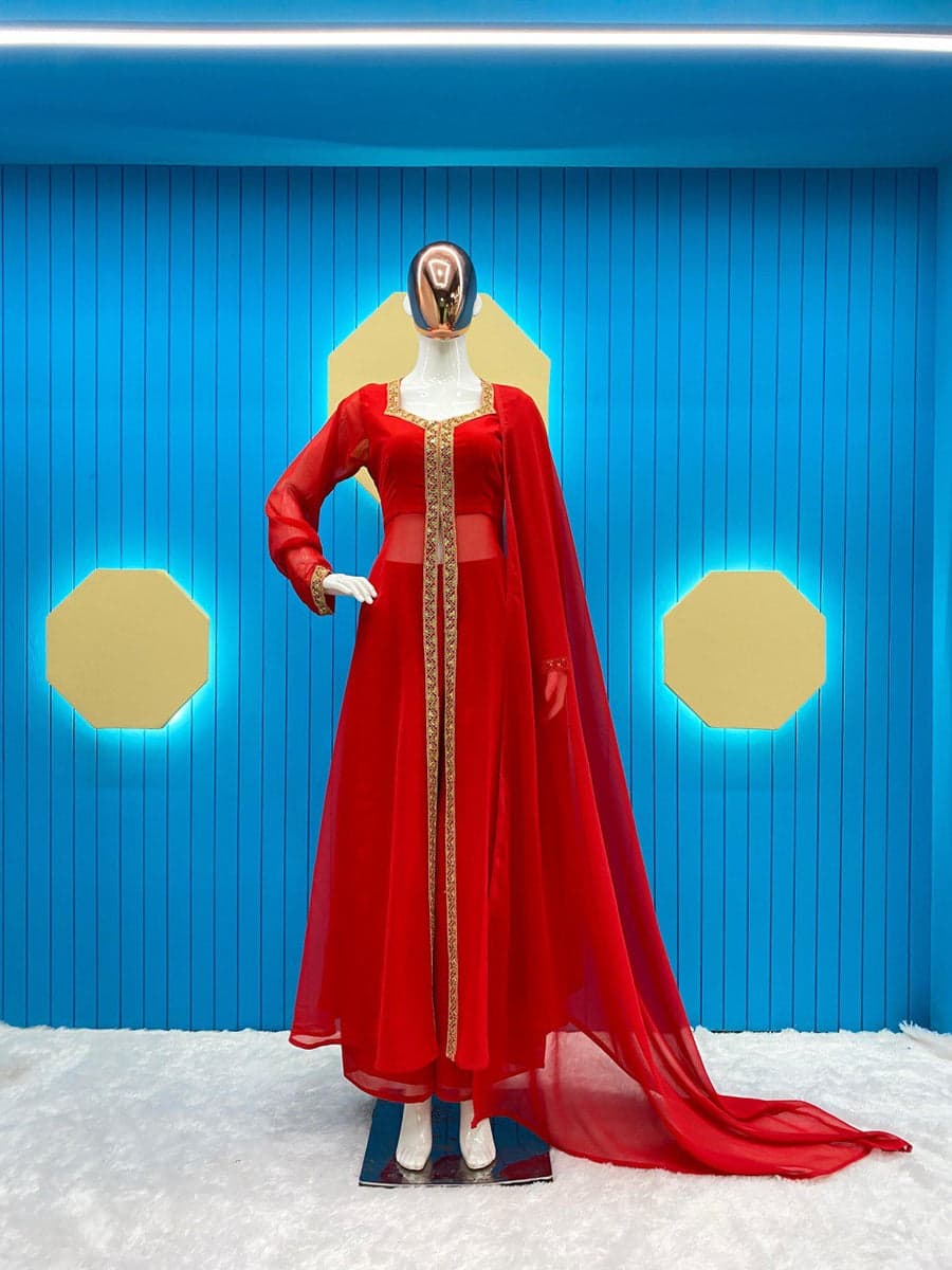 Make a bold and graceful statement with this Premium Red Anarkali Suit Set, designed for women who love elegant and flowy ethnic wear. The rich red color paired with minimal yet classy embroidery makes it a perfect choice for festive occasions and special celebrations.