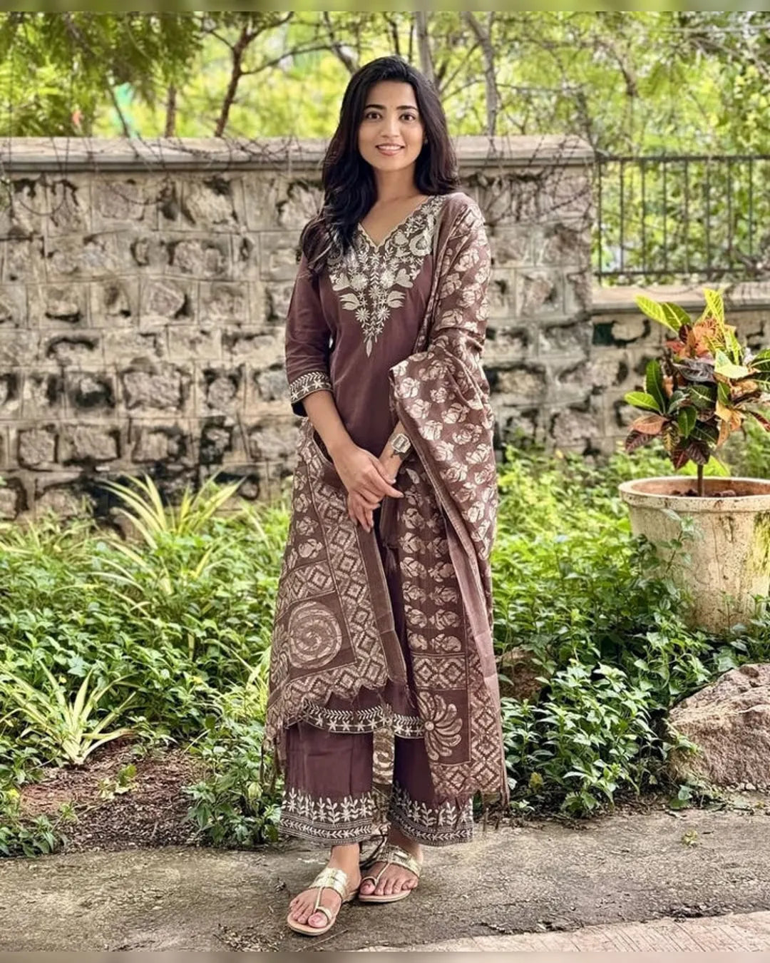 Celebrate timeless elegance with this three-piece ethnic ensemble crafted from premium pure cotton. The kurta features intricate embroidered motifs inspired by traditional Indian artistry, offering breathable comfort for all-day wear. Paired with coordinated trousers for a polished silhouette and a flowing dupatta to complete your look, this set seamlessly transitions from casual gatherings to festive occasions. The natural cotton fabric ensures softness against the skin while maintaining its shape through multiple washes, making it an investment piece for your ethnic wardrobe.