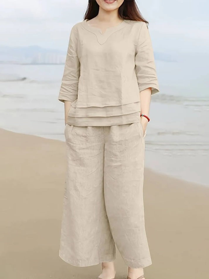 Stay effortlessly stylish and comfortable with this elegant off-white cotton kurti set. Perfect for casual outings, beach walks, or relaxed summer days, this ensemble features a three-quarter sleeve kurti with a unique notched neckline and layered hem, paired with wide-legged palazzo pants
